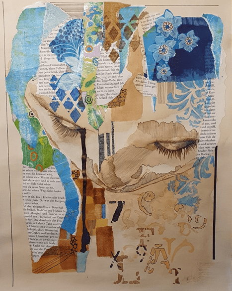 Das Collagewerk drückt Melancholie aus. Trotz der dominanten Farbpalette von Blau- und Brauntönen sowie anderen farbliche Akzenten, wirkt es nicht bunt und fröhlich. Das Bild stellt einen nach unten geneigtes Kindergesicht da, welches auf Zeichen, Buchstaben und Zahlen schaut. Es fokussiert sich auf das, was es lernen soll. Vieles ist schon erlernt, noch mehr soll es sich aneignen. Der Druck der Gesellschaft auf Kinder, die zu schnell erwachsen werden müssen, um den Anforderungen der Welt gerecht zu werden. Kind sein geht verloren.